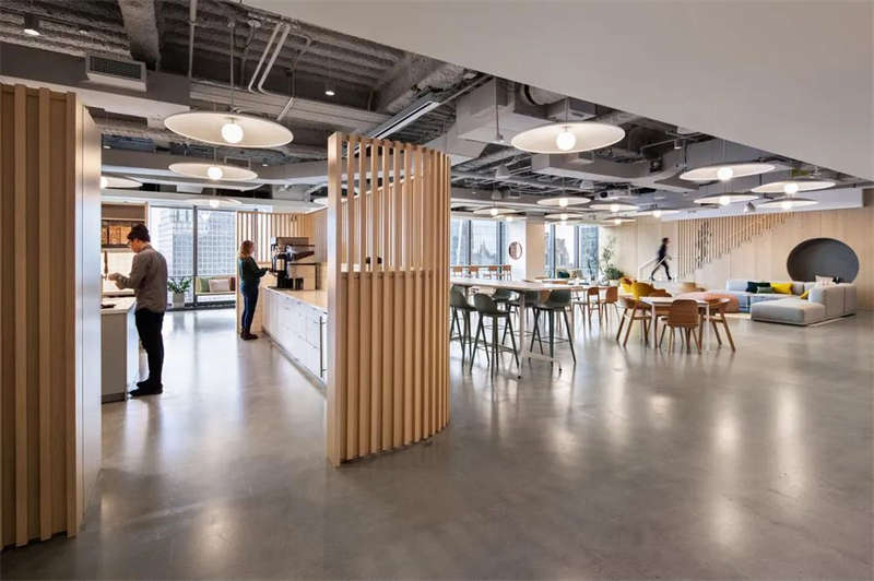 超大的開放式工作區(qū),其間穿插點綴著各式協(xié)作空間——從會議室到電話亭應(yīng)有盡有。兩個樓層都在建筑西側(cè)規(guī)劃了大而開敞的公共區(qū)域,這里享有廣闊的城市景觀視野和充足的日光,并通過一座木制樓梯上下緊密連接。