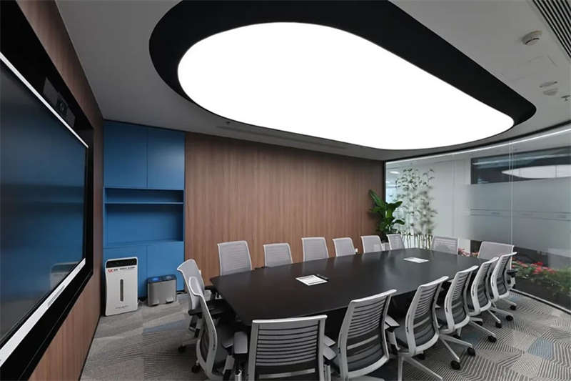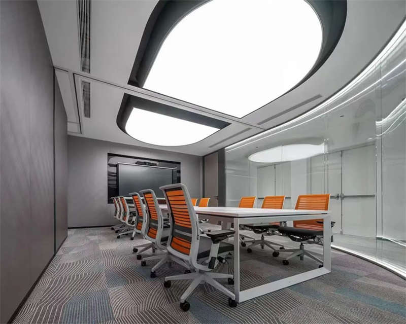 在接待前廳左右兩邊各設置了一個大會議室,其中一個是現(xiàn)代酷灰的可二合一的會議室,另一個是穩(wěn)重優(yōu)雅的行政會議室。感謝成品隔斷供應商卡萊斯卓的緊密配合和支持,在設計師的要求下,把LED燈帶嵌入了雙層玻璃隔斷中。讓整個會議室區(qū)域看上去充滿科技感!