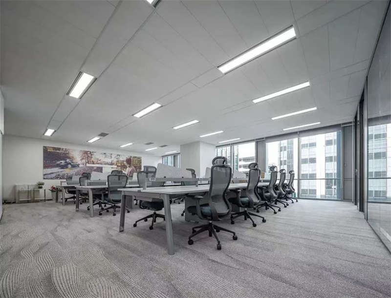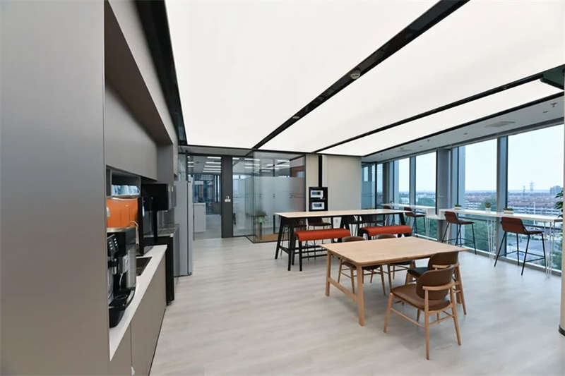 員工區(qū)部份選用了電動可調的升降辦公桌,以滿足員工個性化的需求,白灰色的家具搭配,混搭淺木色的休閑洽談區(qū)域,地面選用流線款長版的無膠水鋪裝的地毯相呼應。提升了空間品質和美感。