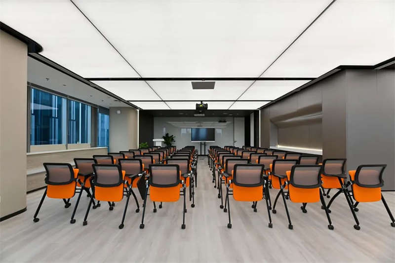設計團隊特意選擇了一處大型開敞的臨窗場地,在酷炫的3D裸眼展示室旁邊打造出了一個4S店風格的培訓和茶水的二合一空間,以滿足客戶快速發(fā)展的團隊培訓和新品發(fā)布的需求。在臨幕墻的位置,設計師原來就設計了一排沿窗的休閑階梯造型臺階,后來因為疫情防控的需求,把臺階內的空間利用好,平時內部可以儲藏睡袋,防疫物資,帳篷等物品。