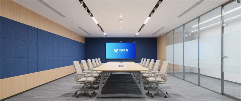 智能會(huì)議室:深藍(lán)色吸音墻面呼應(yīng)企業(yè)VI色,智能屏幕與玻璃隔斷凸顯科技屬性;