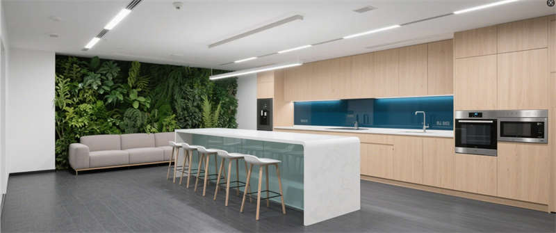 休閑茶水間:白色吧臺(tái)與綠植墻營造松弛氛圍,地膠材質(zhì)耐磨易清潔。