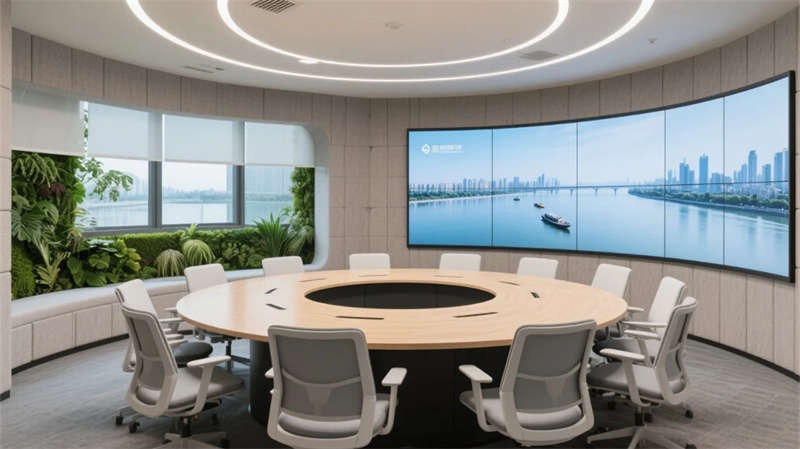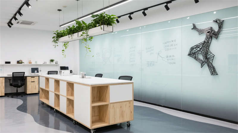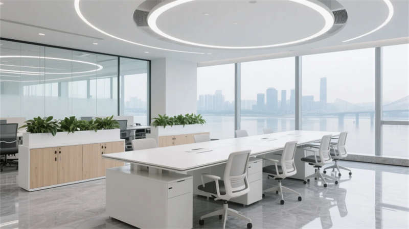 開放辦公區(qū)以模塊化綠植隔斷柔化邊界,智能會議艙曲面屏動態(tài)呈現(xiàn)江岸線,賦予協(xié)作以在地詩意。創(chuàng)意實驗室的可書寫玻璃墻與磁吸家具激發(fā)即興創(chuàng)造,而階梯沙龍區(qū)弧形燈帶如江水蜿蜒,引導思想交匯。
