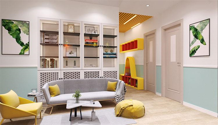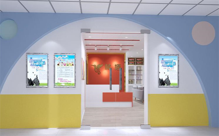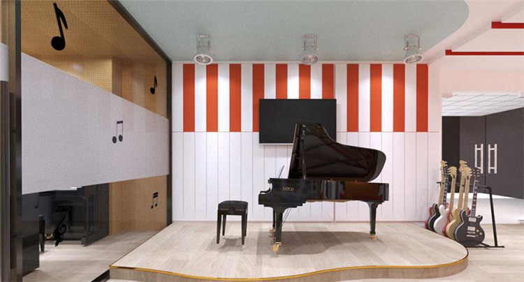 前廳不變的情況下,logo背景墻色調(diào)偏重,所以運(yùn)用了色彩降噪,添加了一些偏冷色調(diào),不僅能夠提升整個(gè)空間的舒適感,還能給孩子一個(gè)安全、放松的空間。結(jié)合了logo的主色調(diào),再進(jìn)行色彩搭配可以形成歡快、親切、活潑的色彩氛圍。與此同時(shí)還設(shè)置了也增加了兩間鋼琴室,提高了空間利用率。大廳玻璃教室內(nèi)墻面貼了吸音板,一方面體現(xiàn)機(jī)構(gòu)在音樂(lè)上的專業(yè)性,另一方面就是讓空間的隔音效果做到最佳,讓孩子在學(xué)習(xí)的時(shí)候不受干擾,能夠安靜的學(xué)習(xí)。
