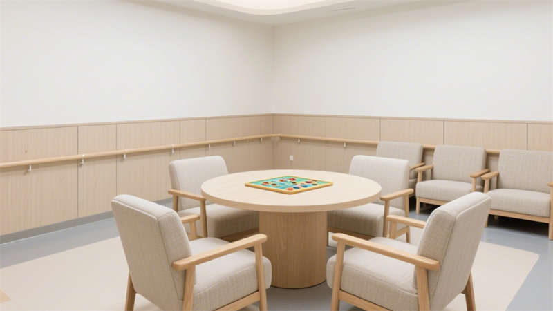 本設(shè)計聚焦養(yǎng)老院室內(nèi)空間的適老化需求與現(xiàn)代審美融合,從居住者的實際生活場景出發(fā),打造兼具安全性與舒適度的環(huán)境。在公共活動區(qū)域,采用無高差地面設(shè)計,搭配防滑耐磨的地面材質(zhì),避免老人行走時發(fā)生磕碰或滑倒;墻面安裝便于抓握的扶手,扶手高度與間距經(jīng)過精心考量,貼合老人起身、行走時的支撐需求,同時扶手外觀融入現(xiàn)代簡約線條,不顯突兀。?