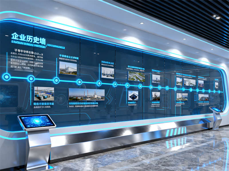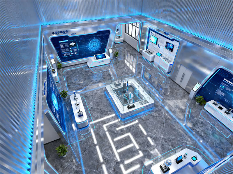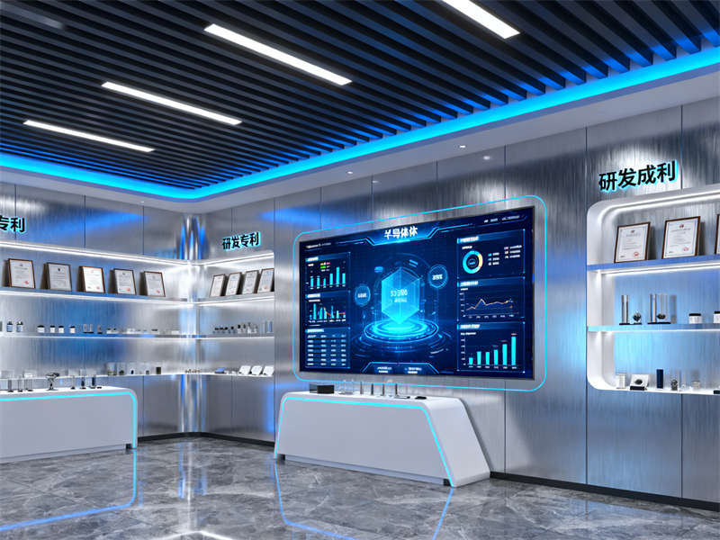 展廳入口處設置了沉浸式視覺裝置,通過光影效果模擬半導體芯片的微觀結(jié)構(gòu),讓參觀者剛進入就能直觀感受到行業(yè)特性。往里走,核心展示區(qū)采用開放式布局,搭配通透的玻璃展柜與懸浮式展臺,既方便參觀者近距離觀察展品,又能讓空間顯得開闊不壓抑。展示區(qū)旁設置了互動體驗區(qū),裝修上融入了柔和的木質(zhì)元素,平衡科技感帶來的冷峻,讓參觀者在互動過程中更顯舒適。?